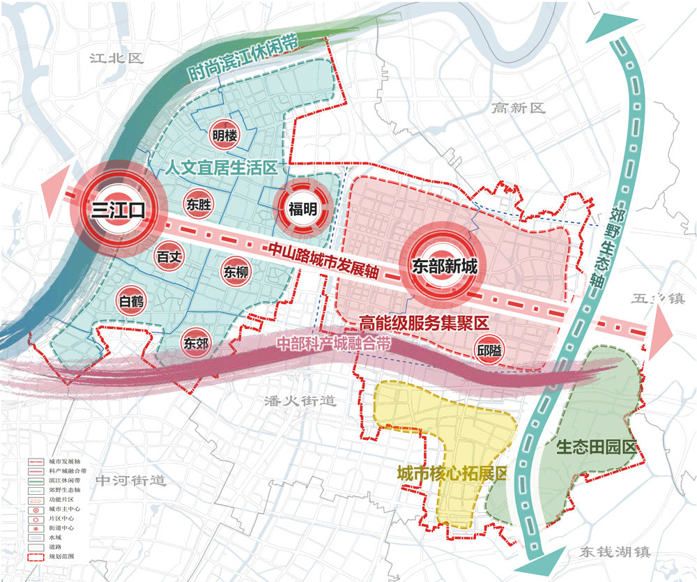 两带:沿甬江形成时尚滨江休闲带,沿杭甬高速形成中部科产城融合带;